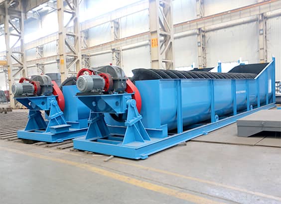 FC and FG Series Spiral Classifier is mainly used in pre-classification and examination classification of grinding circuit in concentration plant and aggregate plant as well as desliming and dehydration in the process of sand washing. It can be classified into single spiral and double spiral according to the spiral quantity; and high weir type and sinking type according to the different depth of blade dipping into overflow surface. The former one can be used in classification of ore and sand washer with overflow granularity 0.83-0.15mm, and the other one in classification of ore and fine powder with overflow granularity 0.15-0.07mm. The machine has features of reliable performance, stable operation, excellent sand washing and classifying. The machine is used to control the loss amount of powder for sand washing in the aggregate system.